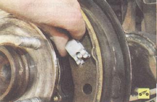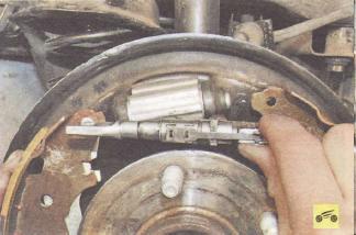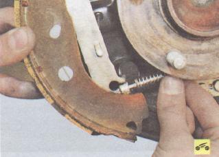 7. Отведите немного назад заднюю колодку и снимите распорную планку в сборе с регулятором зазора.