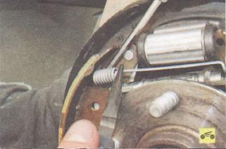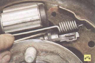 6. Подденьте отверткой и отцепите пассатижами от задней колодки отогнутый конец верхней стяжной пружины, отцепите ее второй конец от передней колодки и снимите пружину.