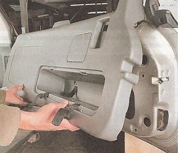 Сама обшивка очень крепко сидит на клипсах. Аккуратно, но сильно тянем ее за нижнюю часть  и отрываем от панели.
