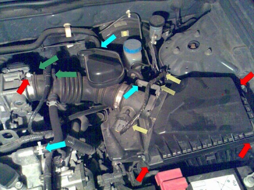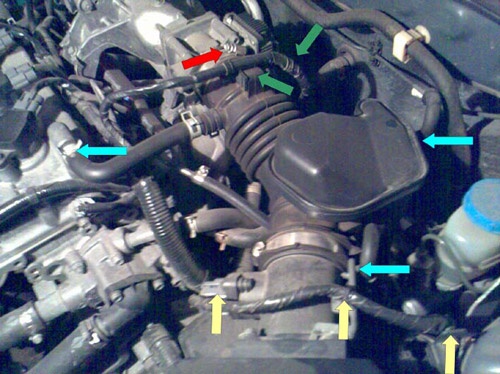 Для начала нужно отсоединить разъем и жгут ДРВМ (помечено жултыми стрелками). Затем отсоединяем разъем и жгут самого дросселя (помечено зелеными стрелками). Затем нужно отсоединить вентиляционные шланги (помечено голубыми стрелками) и ослабить хомут дросселя, отстегнув затем верхнюю крышку воздушного фильтра (помечено красными стрелками). На фото стрелки направлены на одни и те же точки, просто с разных ракурсов.