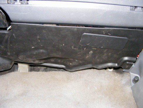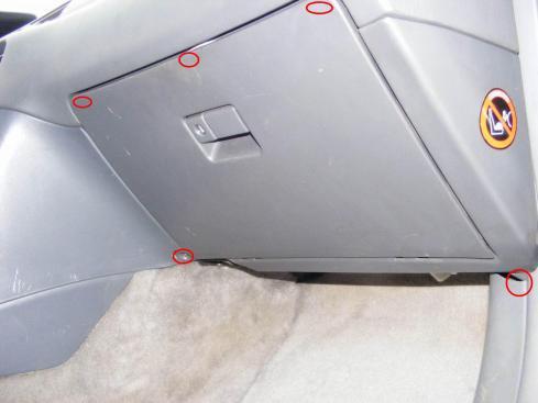 Для начала под бардачком необходимо демонтировать черную декоративную крышку, просто потянув ее вниз. Крышка закреплена на защелках. Теперь нужно снять сам бардачок. Для чего выкручиваем шурупы и один болт. Кроме того, его удерживают защелки. Не забудьте отсоединить кабель подушки безопасности от корпуса бардачка.