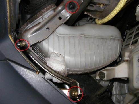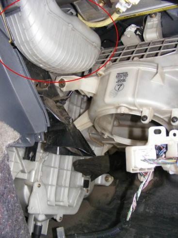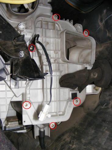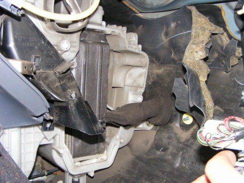 Снимаем часть воздуховода, которая расположена ближе к центральному тоннелю. Потом приступаем к снятию корпуса вентилятора печки. Он закреплен в четырех точках. Четвертый болт расположен вверху в области воздухозаборника и подушки безопасности.
