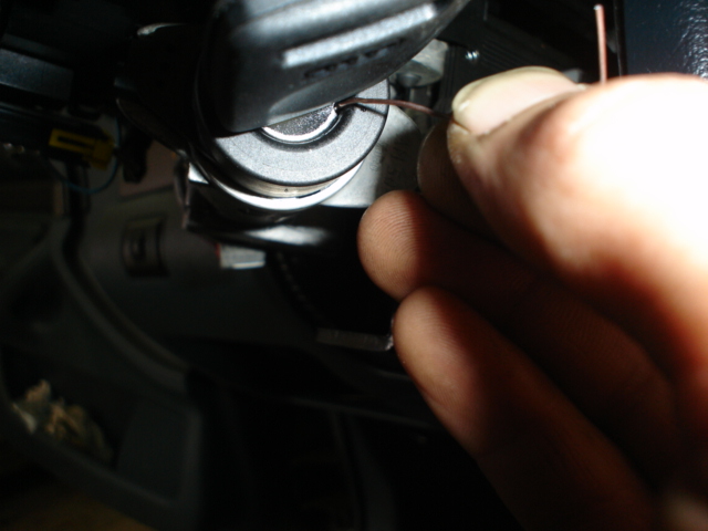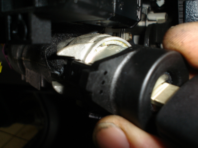 • затем надавливаем на скрепку она должна провалиться на 3 – 4мм. Затем проверяем все ли так для этого попробуем провернуть ключ зажигания (при этом надавливая на скрепку) если всё ОК то ключ не будет проворачиваться более чем на 2мм. влево – вправо (люфт ключа в личинке), затем