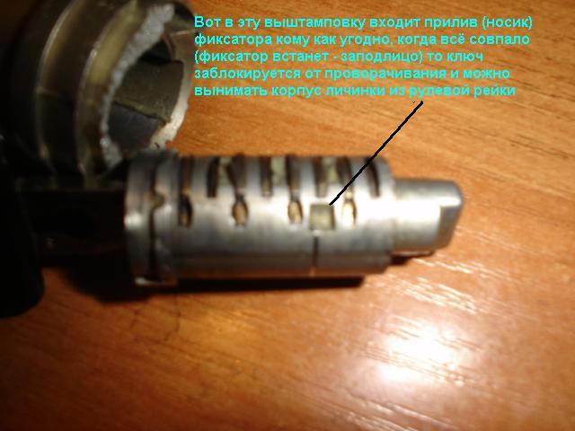 • Берем новый корпус личинки (замок) на нем зажигание вкл и совмещаем метки до того пока фиксатор личинки полностью не утопиться (заподлицо) и вставляем его до упора (щелчок открывшегося фиксатора, значит хватит)