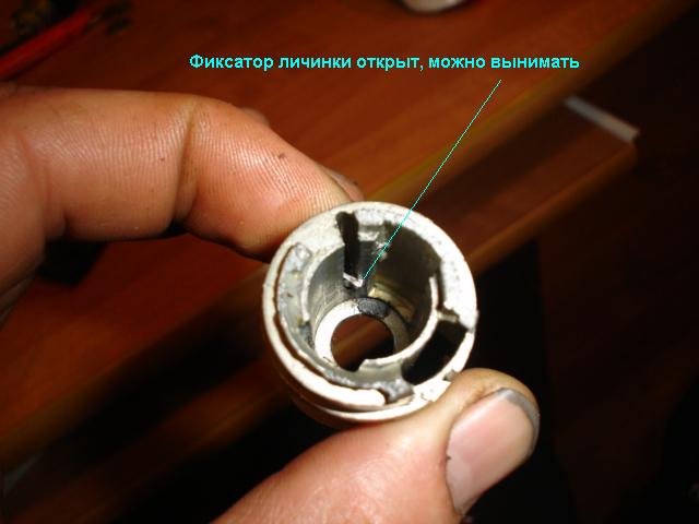 • Вставляем в отверстие разогнутую скрепку лучьше D=0,5 мм и нащупываем фиксатор корпуса личинки,