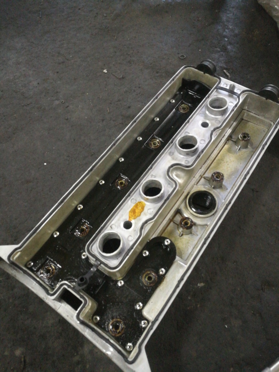 2) маслоотделитель/маслоуловитель - картерные газы туда поступают с высоким содержанием масляных паров и пока проходят по "лабиринтам", оседают на стенках и стекают вниз. На выходе получаются более чистые картерные газы. В пластиковой крышке это тоже есть, но оно неразборное - можешь увидеть пластиковые заклепки, если крышку почистить как следует ;)
