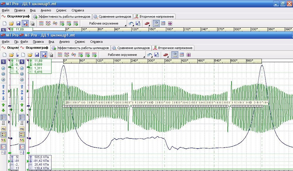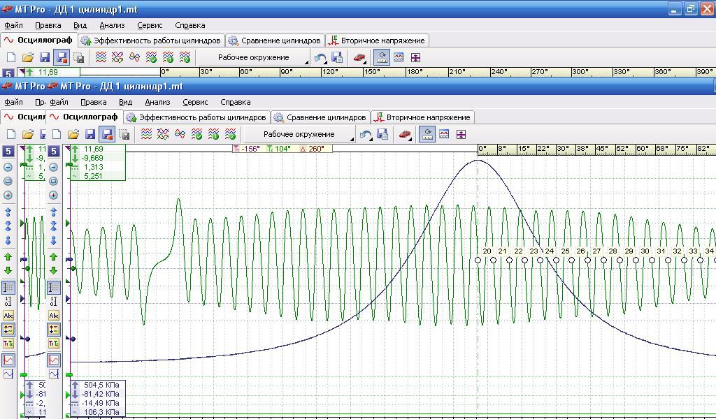 Если с осцилом работал, то должен понять! На скрине два сигнала-датчик давления в первом цилиндре (синий) и сигнал с ДПКВ (зеленный).