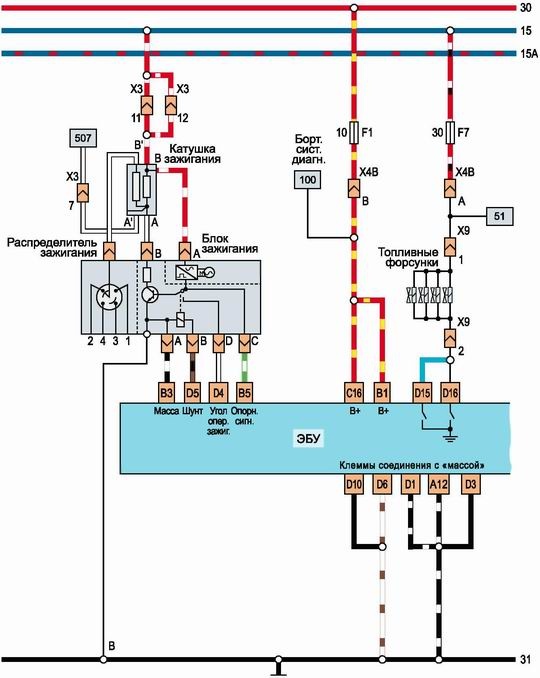 Если да, проверяйте наличие опорных импульсов (датчик импульсов зажигания трамблёра), (на схеме вывод С) без них не будет искры и не будут открываться форсунки.