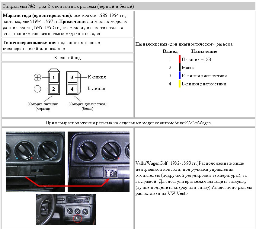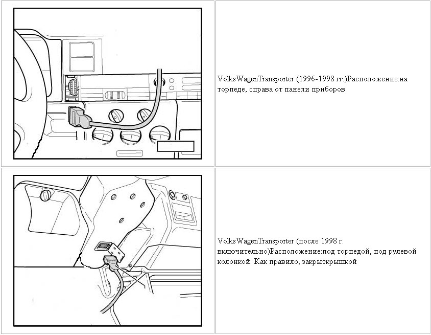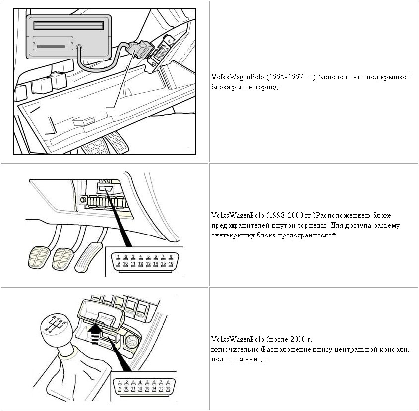 В зависимости от года выпуска и модели, автомобили Volkswagen имеют следующее расположение диагностического разъема: