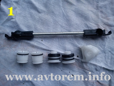 Для этого придется купить этот самый ремкомплект, состоящий из из тяги выбора передач и пяти пластмассовых втулок с резиновыми кольцами.