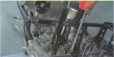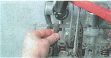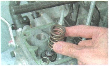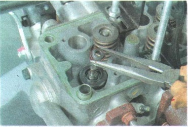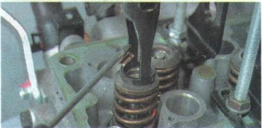 Сжимая рассухаривателем пружину, устанавливаем сухари клапана.