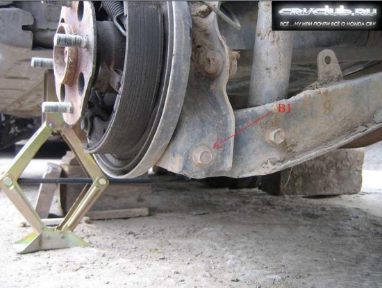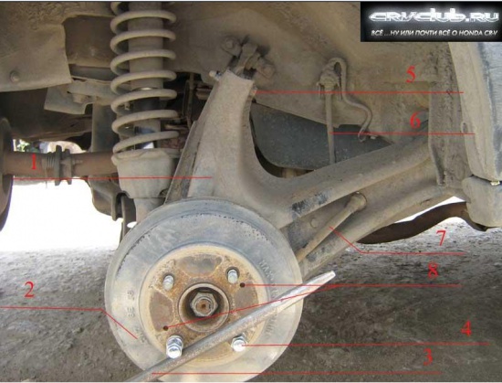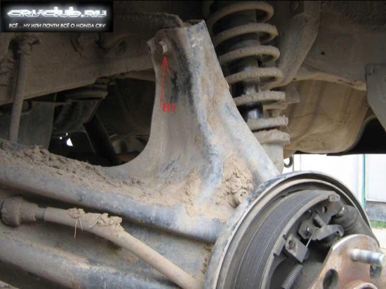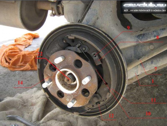 Для замены сайлентблока рычаг 1 придется снимать. Для этого надо снять тормозной механизм.
