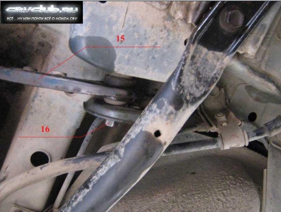 Откручиваем и высвобождаем сам рычаг. Сначала откручиваем "рычаг задний поперечный малый нижний" 15,который находиться в конце качающегося рычага, под днищем около бензобака. Его удобнее откручивать от кузова, чем от качающегося рычага, крепление 16.