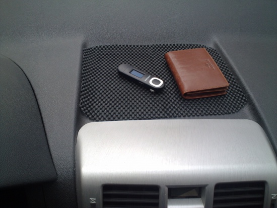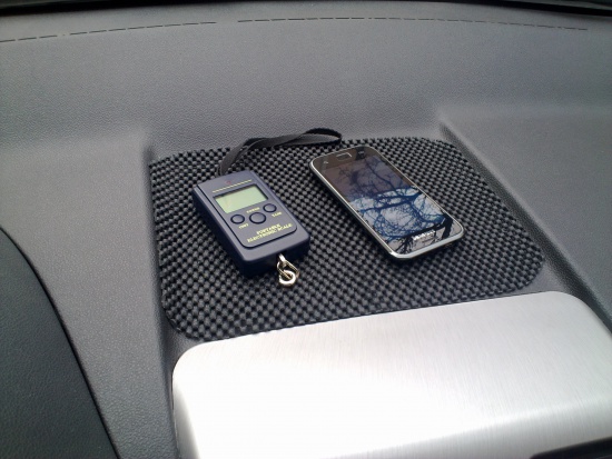 В итоге коврик прекрасно лег в углубление панели. Его не нужно ничем клеить, держится как на присосках. Теперь я спокойно могу бросить на нее телефон или безмен