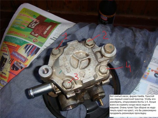 Выверните регулировочный болт, болты крепления насоса гидроусилителя и снимите насос
