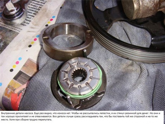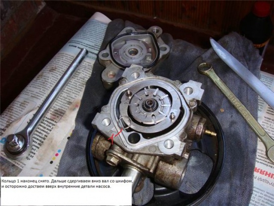 Вал со шкивом стягиваем вниз и осторожно вынимаем внутренности насоса