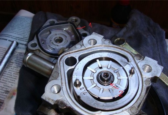 Снимаем крышку, обращая внимание на целостность прокладки (1). Снимаем стопорное кольцо (2). С ним придется повозится.