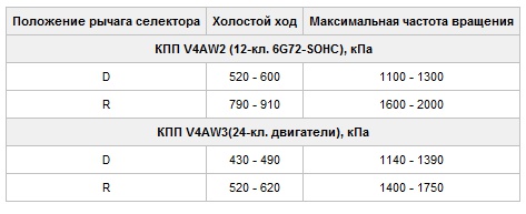7. Переведите рычаг селектора в положение "D" и измерьте давление скоростного регулятора на каждом режиме работы двигателя, указанном в таблице.