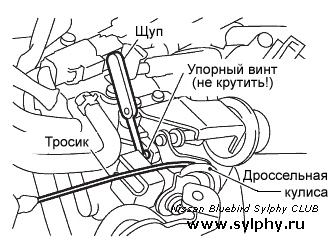 4. Вставить щуп между упорным винтом и ДЗ толщиной 0,05 мм - цепь должна существовать;